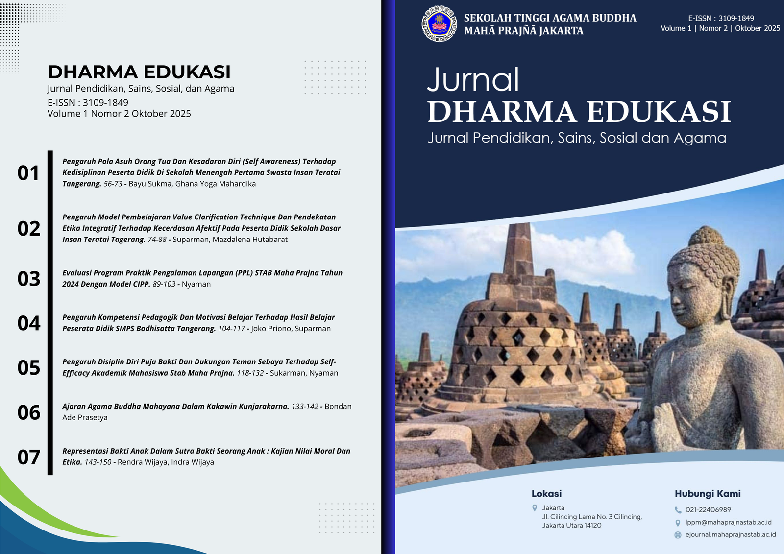 Jurnal Pendidikan, Sains, Sosial dan Agama (Dharma Edukasi) adalah jurnal ilmiah multidisipliner yang diterbitkan oleh Sekolah Tinggi Agama Buddha Maha Prajna Jakarta. Pada edisi periode Oktober – Maret 2025-2026, DharmaEd kembali menghadirkan artikel-artikel berbasis penelitian yang mendalam dan relevan, mencakup berbagai topik yang berada dalam cakupan pendidikan, ilmu pengetahuan (sains), ilmu sosial, serta kajian keagamaan.
